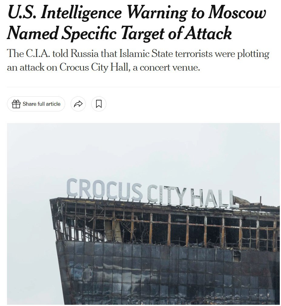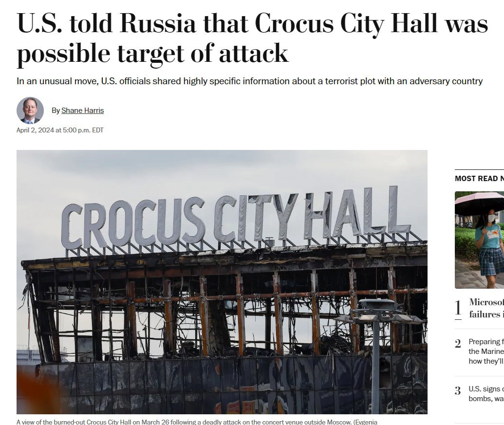 США предупреждали Россию, что конкретно концертный зал "Крокус Сити Холл" под Москвой может стать целью теракта.