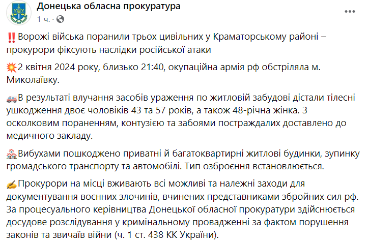 В результате обстрела Николаевки под Краматорском в Донецкой области ранены три человека. Повреждены дома, остановка общественного транспорта и автомобили.