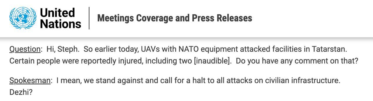 В Организации Объединенных Наций осудили недавнюю атаку дронов по заводам в российском Татарстане.