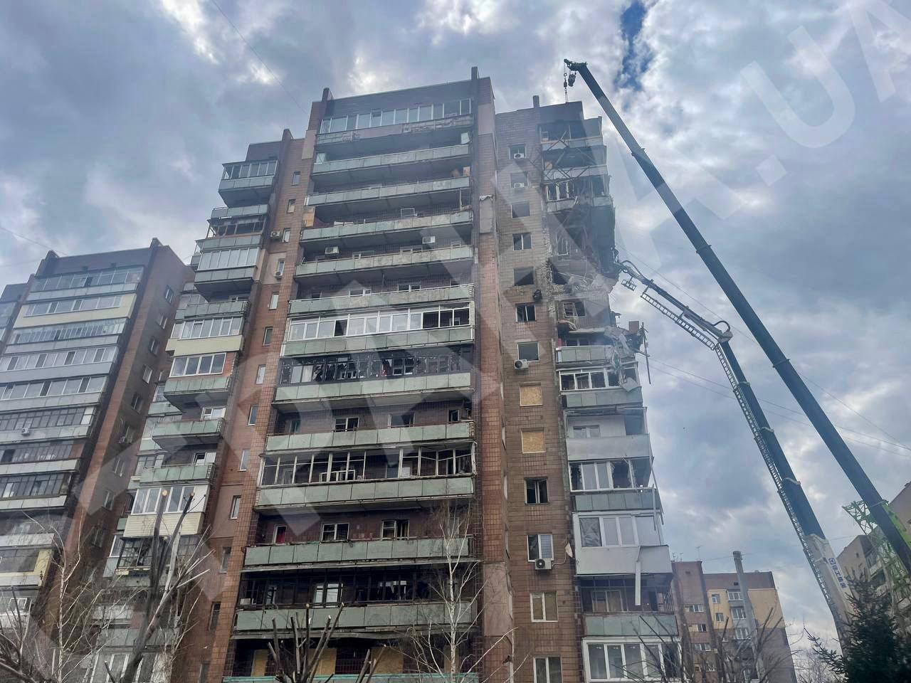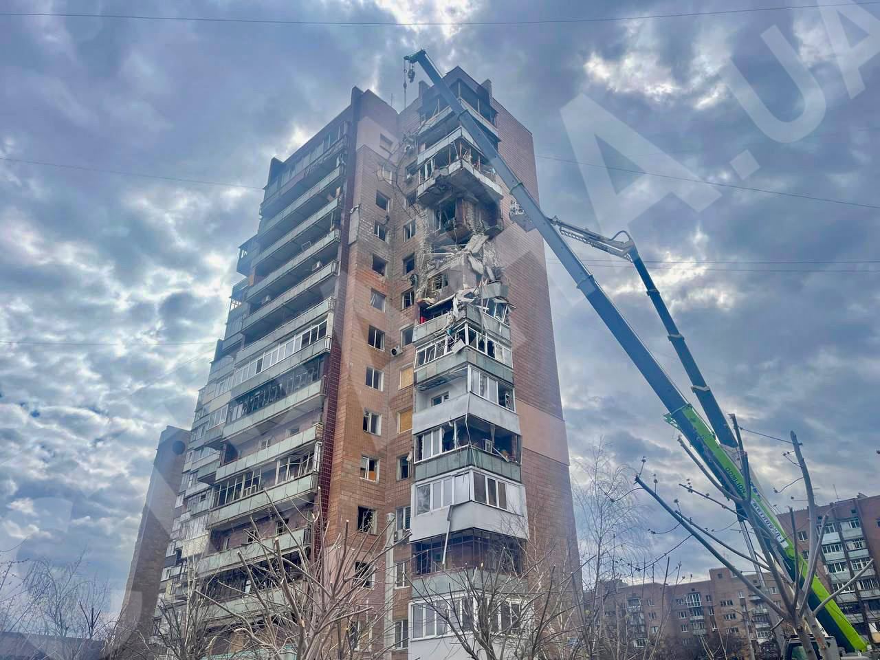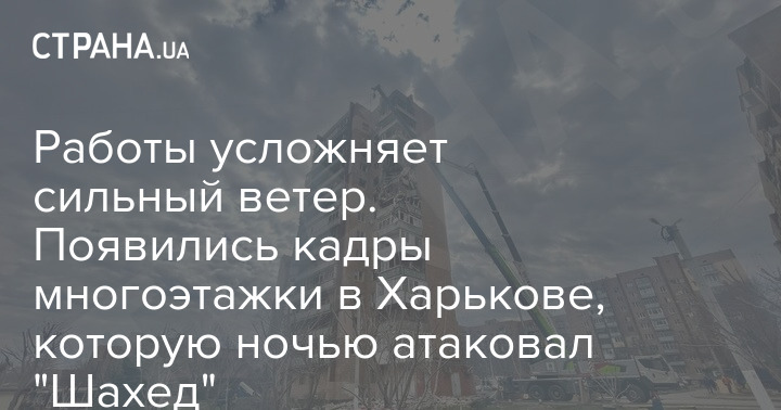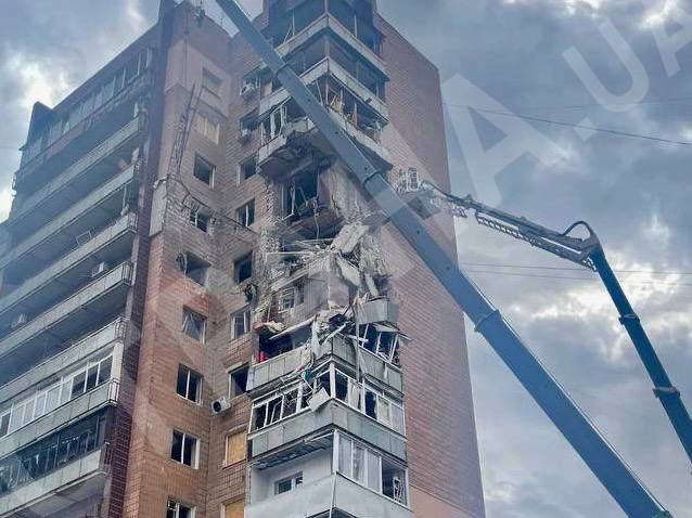 Кадры пострадавшего 14-этажного дома в Харькове в результате ночной атаки "Шахедами". На месте продолжается разбор завалов.