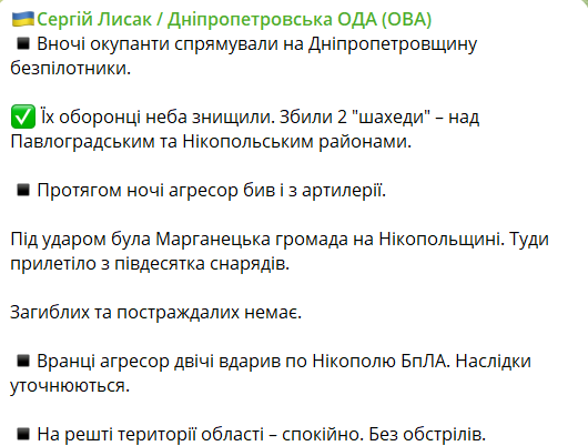 07:56 Ночью российские войска атаковали Днепропетровскую область беспилотниками. Были уничтожены два "Шахеда" над Павлоградским и Никопольским районами.