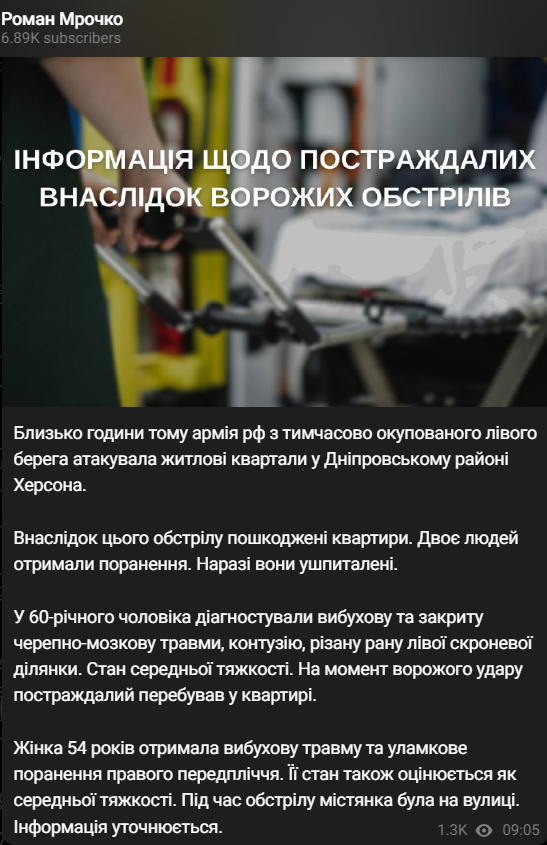 10:20 Сегодня утром российская армия с временно оккупированного левого берега атаковала жилые кварталы в Днепровском районе Херсона. Два человека получили ранения.