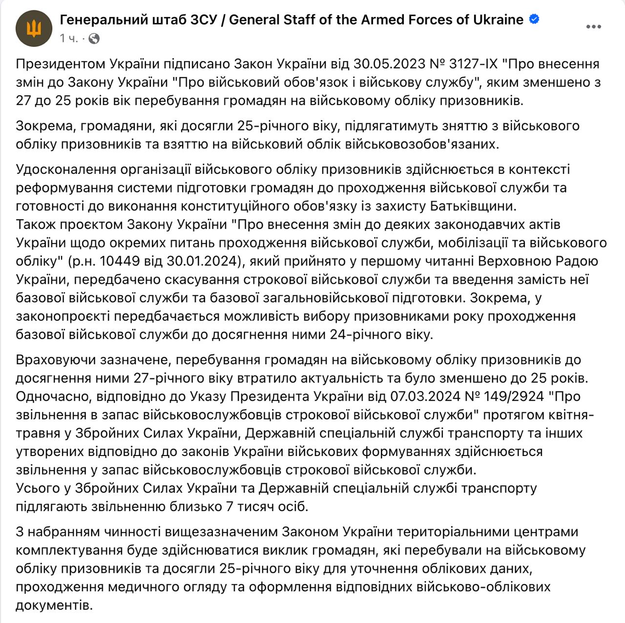 Об этом сообщает Генштаб, разъясняя, как будет работать подписанный президентом закон о снижении планки призывного возраста с 27 до 25 лет.