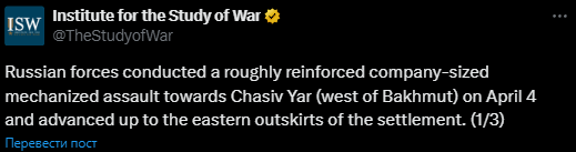 Американский Институт изучения войны сообщает, что 4 апреля российские войска провели "усиленный механизированный штурм" в направлении Часова Яра и продвинулись до восточной окраины населенного пункта по дороге со стороны Хромово.