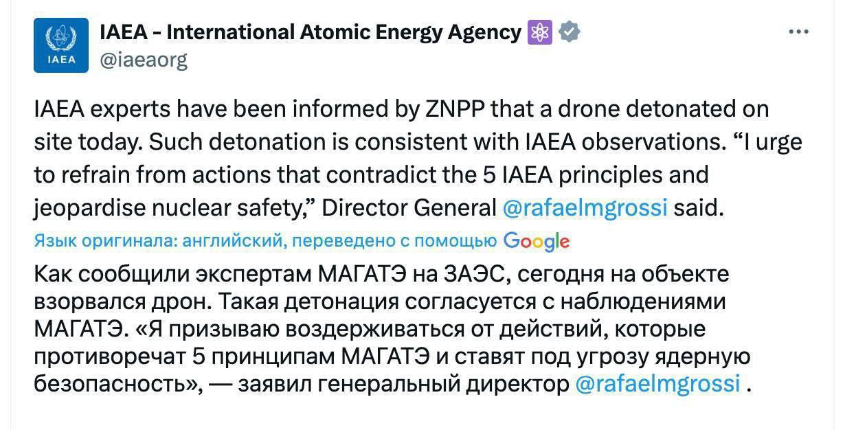 18.04 МАГАТЕ сообщает, что на Запорожской АЭС взорвался дрон
