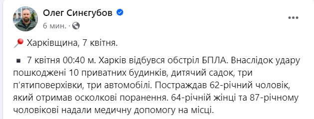 "7 апреля 00:40 г. Харьков произошел обстрел БПЛА. В результате удара повреждены 10 частных домов, детский сад, три пятиэтажки, три автомобиля. Пострадал 62-летний мужчина, получивший осколочные ранения. 64-летней женщине и 87-летнему мужчине оказали медицинскую помощь на месте", - написал он.