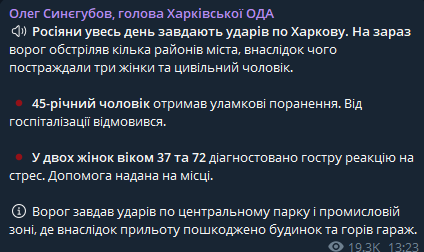 Глава Харьковской ОВА Олег Синегубов сообщил, что россияне ударили по центральному парку и промышленной зоне, где в результате прилета поврежден дом и горел гараж.