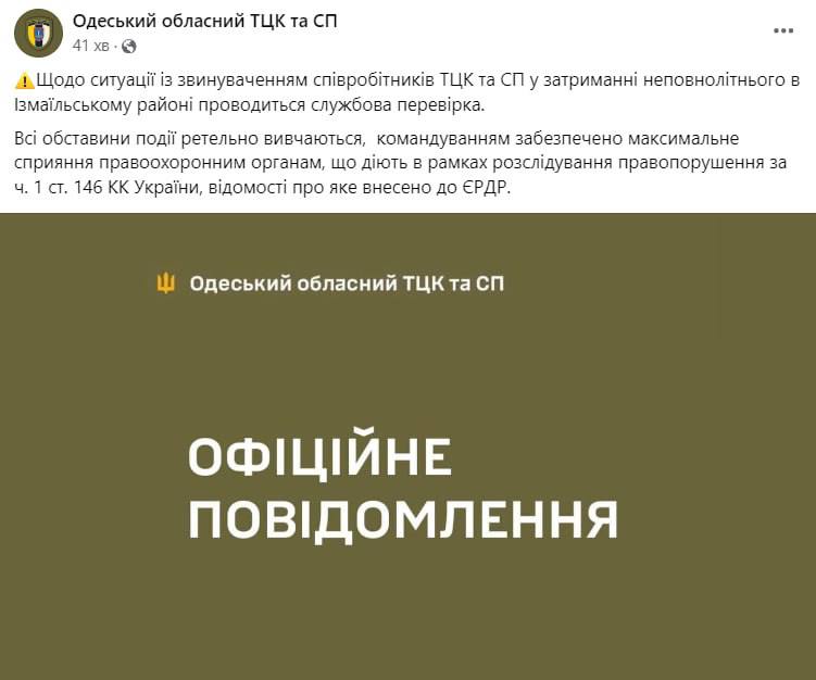 Также  Одесский ТЦК начал служебную проверку по факту задержания военкомами 14-летнего парня.
