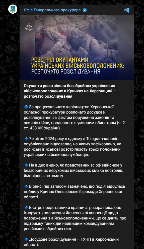 Офис генпрокурора ссылается на сегодняшнее видео из телеграм-каналов, где, как сообщается, российские военные расстреливают троих пленных украинских военнослужащих.