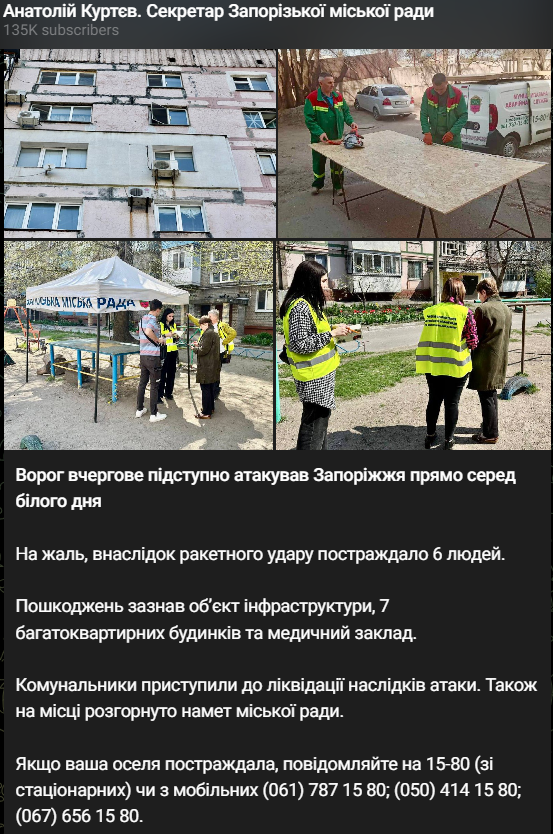 "Враг в очередной раз коварно атаковал Запорожье прямо среди бела дня", - написал Куртев.