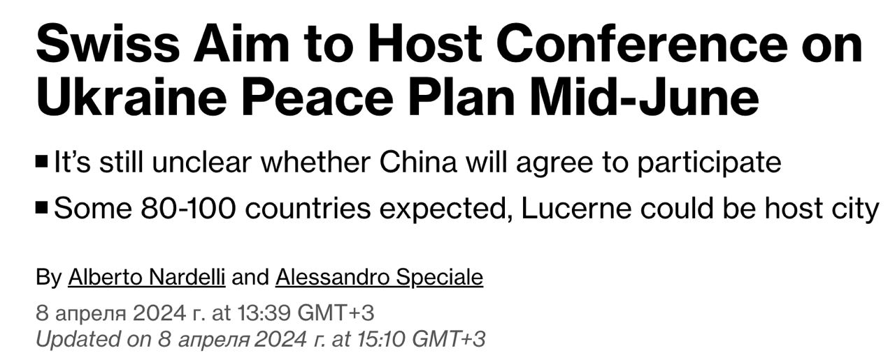 Швейцария намерена провести мирную конференцию по Украине в середине июня 2024 года. Ожидается около 80-100 стран, в том числе, и "глобального Юга".