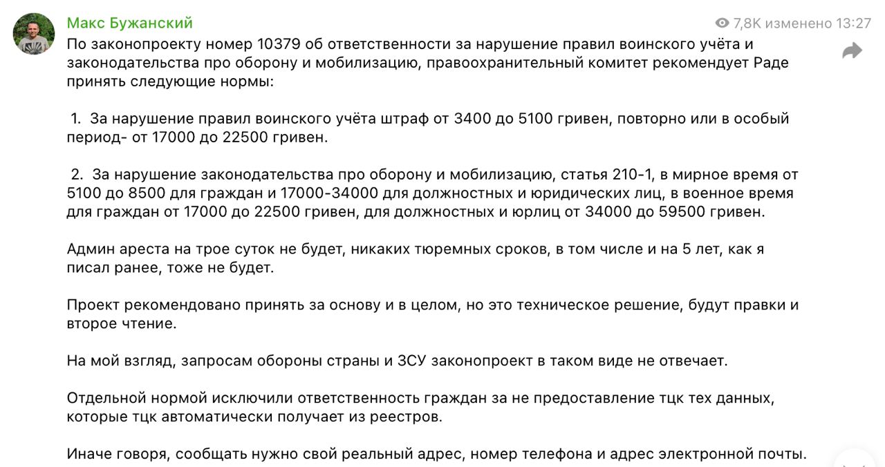 "Админ ареста на трое суток не будет, никаких тюремных сроков, в том числе и на 5 лет, как я писал ранее, тоже не будет. Отдельной нормой исключили ответственность граждан за не предоставление тцк тех данных, которые тцк автоматически получает из реестров. Иначе говоря, сообщать нужно свой реальный адрес, номер телефона и адрес электронной почты", - пишет Бужанский.