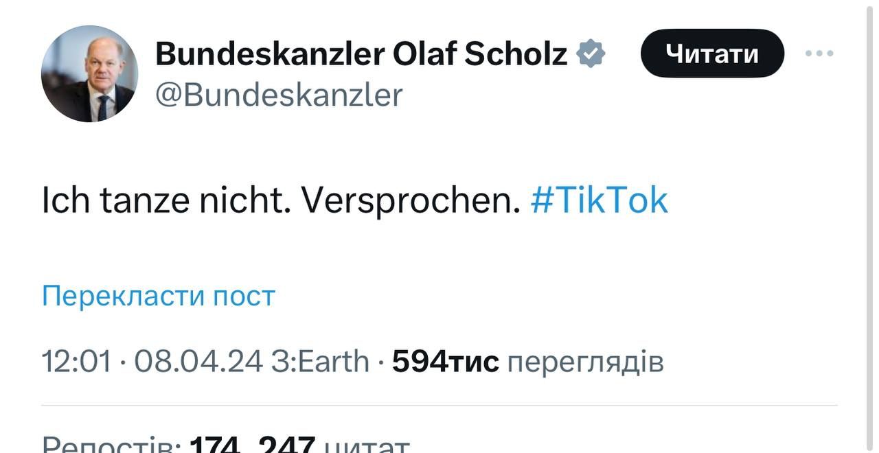 "Я не буду танцевать. Обещаю. #TikTok", - написал Шольц, анонсируя эту новость.