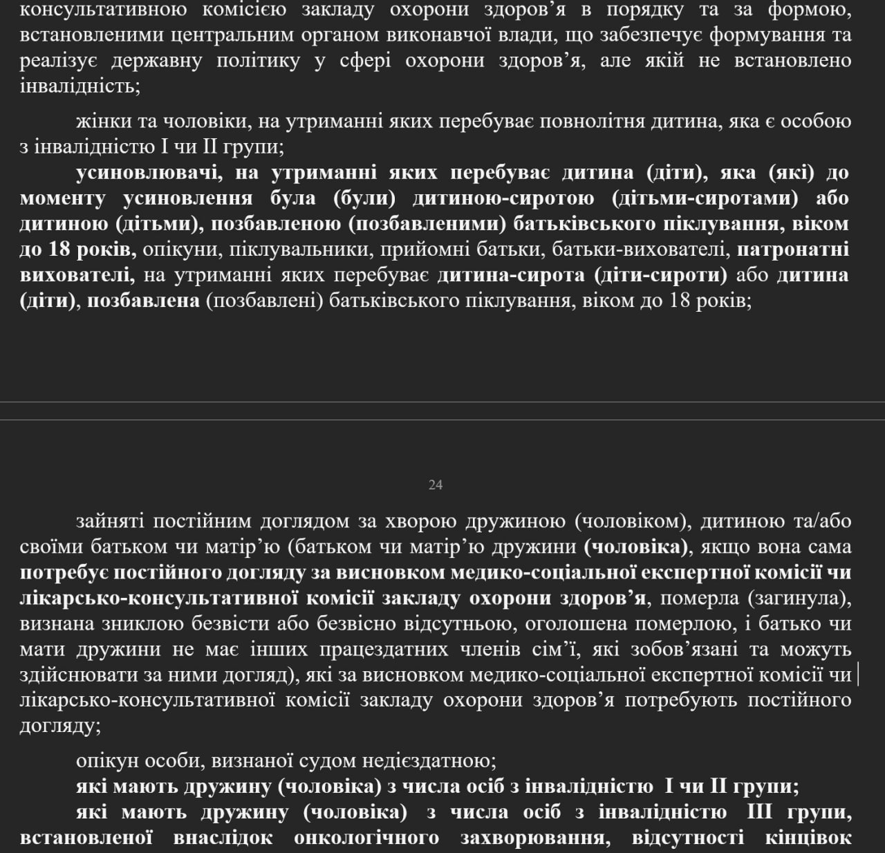 Проект усложнил правила отсрочки для тех, у кого на содержании родители-инвалиды 1-й и 2-й групп. Если из супругов-опекунов один невоеннообязанный, то второго могут мобилизовать. То есть если жена не идет служить, то в армию могут забрать мужа. Единственное исключение - ситуации, когда супруга будет сама нуждаться в медицинском уходе (и это подтвердит медицинская комиссия).
