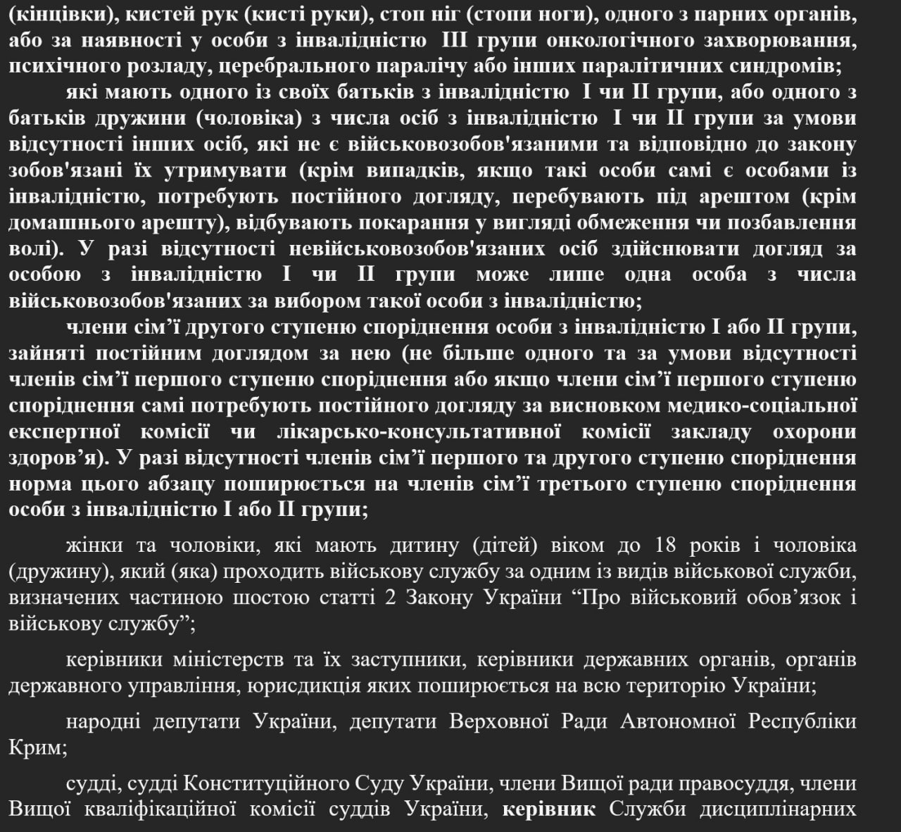 - Для супругов инвалидов третьей группы ввели ограничения. Они освобождаются от мобилизации лишь в случае инвалидности, установленной вследствие онкологического заболевания, отсутствия конечности, кисти, стопы, одного из парных органов, психического расстройства при онкологическом заболевании, церебрального паралича или других паралитических синдромов.