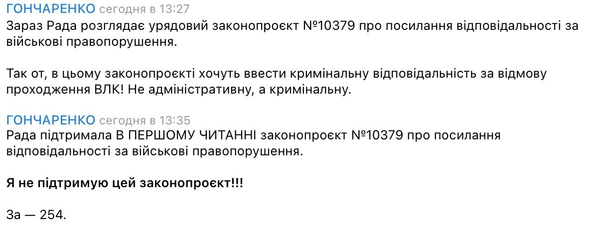 После принятия нардеп Алексей Гончаренко заявил, что принятый документ вводит уголовную ответственность за отказ от прохождения военно-врачебной комиссии (ВВК). Но затем он и другие депутаты опровергли эту информацию.