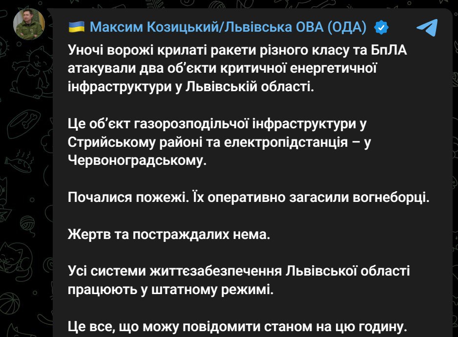 "Это объект газораспределительной инфраструктуры в Стрыйском районе и электроподстанция – в Червоноградском. Начались пожары. Их оперативно потушили пожарные. Жертв и пострадавших нет. Все системы жизнеобеспечения Львовской области работают в штатном режиме", - отметил Козицкий.
