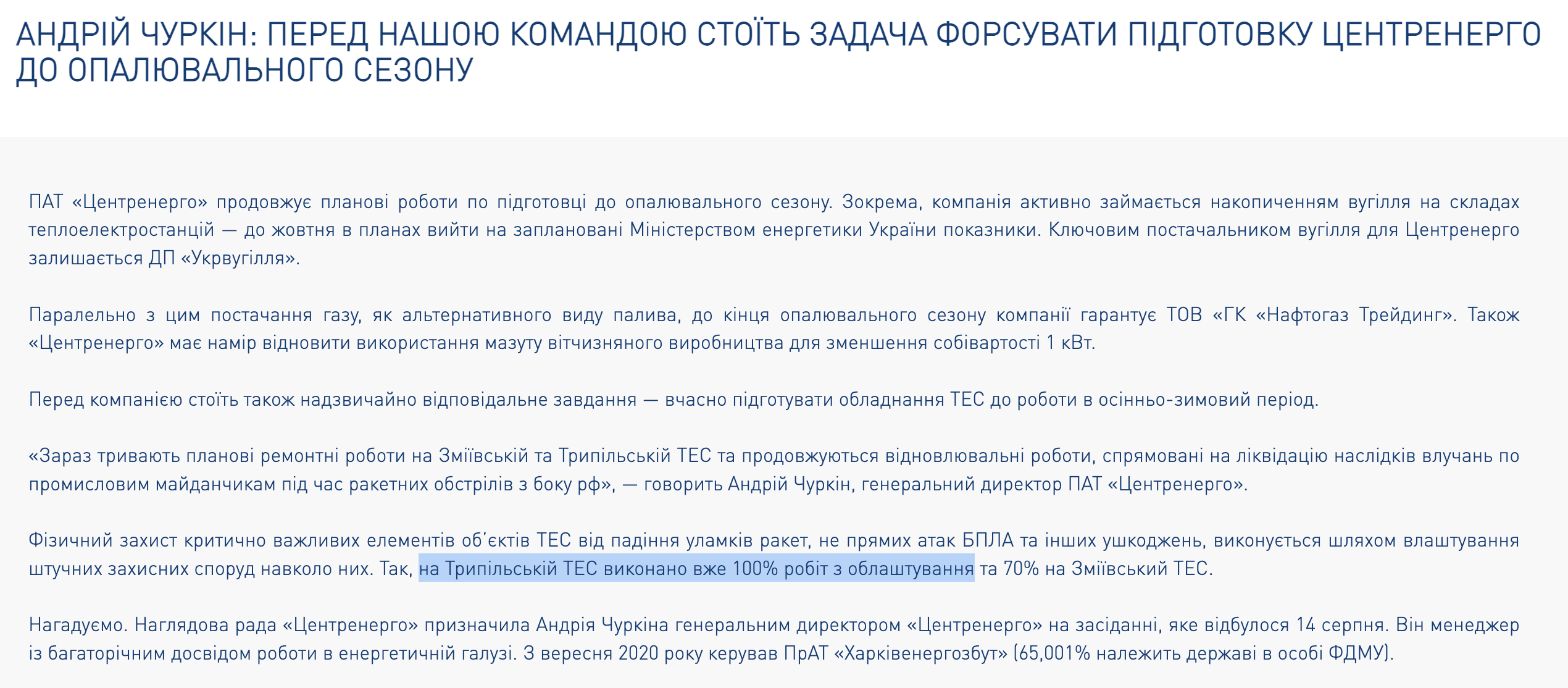 Тогда же сообщалось, что на Змиевской ТЭС работы были завершены на 70%. Этот объект тоже разрушен обстрелом в марте этого года.