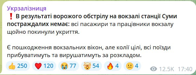 "В результате вражеского обстрела на вокзале станции Сумы пострадавших нет. Все пассажиры и работники вокзала только что покинули укрытие. Есть повреждения вокзальных окон, но пути целые, все поезда будут прибывать и отправляться по расписанию", - сообщили в УЗ.