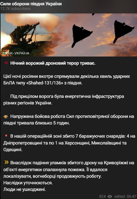 Сообщается, что было уничтожено 7 барражирующих снарядов: 4 в Днепропетровской области и по 1 в Херсонской, Николаевской и Одесской областях.