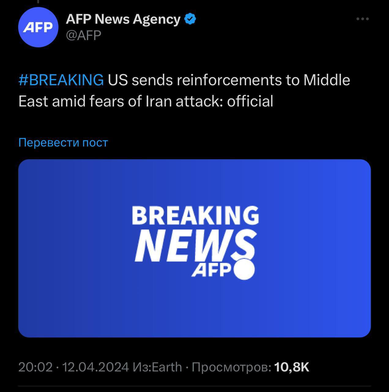 АFP тем временем сообщает, что США перебрасывают подкрепление на Ближний Восток в ожидании атаки Ирана на Израиль.