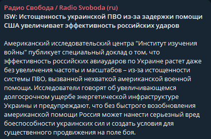 В докладе говорится о том, что эффективность российских авиаударов по Украине растет даже без увеличения частоты и масштабов – из-за истощенности системы ПВО, вызванной нехваткой американской военной помощи.
