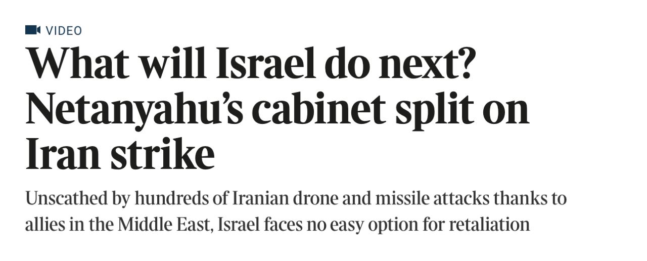 Сразу после атаки Ирана в субботу министры Бени Ганц и Гади Айзенкот предложили немедленно начать контратаку. Нетаньяху и другие члены военного кабинета выступили против, потому что еще не было ясно, повлекло ли иранское нападение какой-либо ущерб или жертвы.