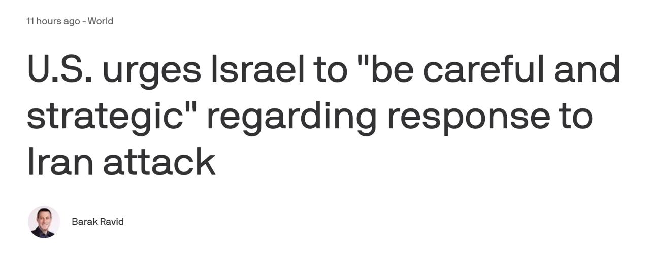 Так, газета Politico сообщает, что администрация Байдена призывает Израиль не отвечать, чтобы не провоцировать дальнейшую эскалацию. У Трампа это называют "позором" для США. Глава МИД Ирана заявил, что Тегеран больше не планирует новых атак, только ответные в случае ударов по нему.