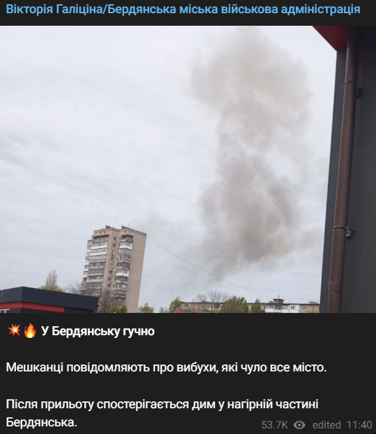 "Жители сообщают о взрывах, которые слышал весь город. После прилета наблюдается дым в нагорной части Бердянска", - написала она.