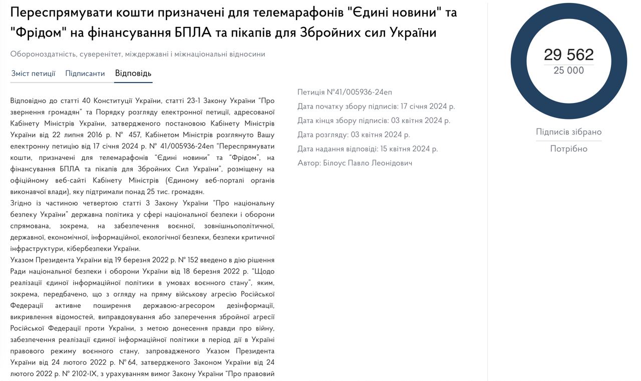 Петиция о том, что эти деньги лучше потратить на закупку дронов и пикапов для ВСУ, набрала необходимые 25 тысяч голосов. На нее ответил Шмыгаль.