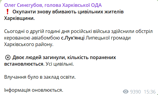 "Сегодня в два часа дня российские войска произвели обстрел управляемой авиабомбой с.Лукьянцы Липецкой громады Харьковского района", - написал он.