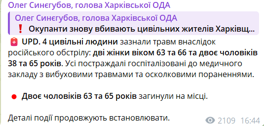 "Двое мужчин 63 и 65 лет погибли на месте", - написал Синегубов.