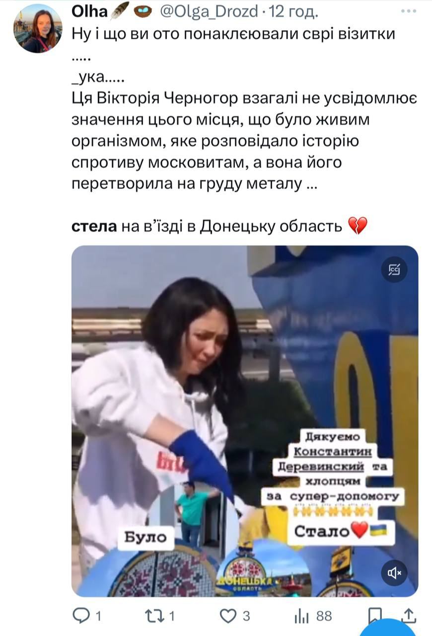 "Это был памятный знак со сверхмощным смыслом и историей, а не просто объявление о въезде в область. Там были подписи наших побратимов, которых уже нет в живых. Может, это так больно, потому что ничего еще не закончилось, а уже краской зарисовано, будто ничего и не было".