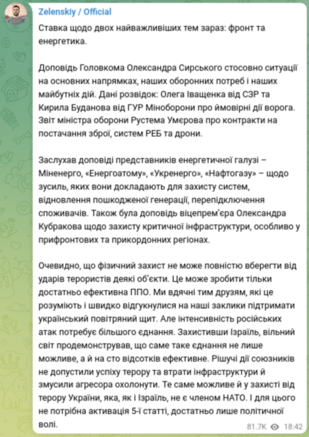 "Защитив Израиль, свободный мир продемонстрировал, что именно такое единение не только возможно, но и полностью эффективно. Решительные действия союзников не допустили успеха террора и потери инфраструктуры и заставили агрессора остыть. То же возможно и в защите от террора Украины, которая, как и Израиль, не является членом НАТО. И для этого не нужна активация 5 статьи, достаточно лишь политической воли", – написал Зеленский.