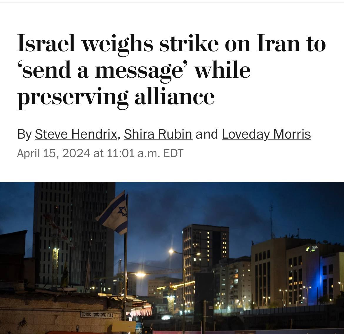 Израиль обсуждает такой ответ на атаку Ирана, чтобы он не разозлил союзников и не разрушил возможность построить альянс против Тегерана, говорится в статье.