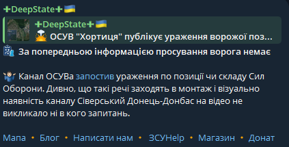 Они отметили тот факт, что ОСУВ "Хортица" выставил "поражение по позиции Сил Обороны. Удивительно, что такие вещи заходят в монтаж и визуально наличие канала Северский Донец-Донбасс на видео не вызывало ни у кого вопросов".