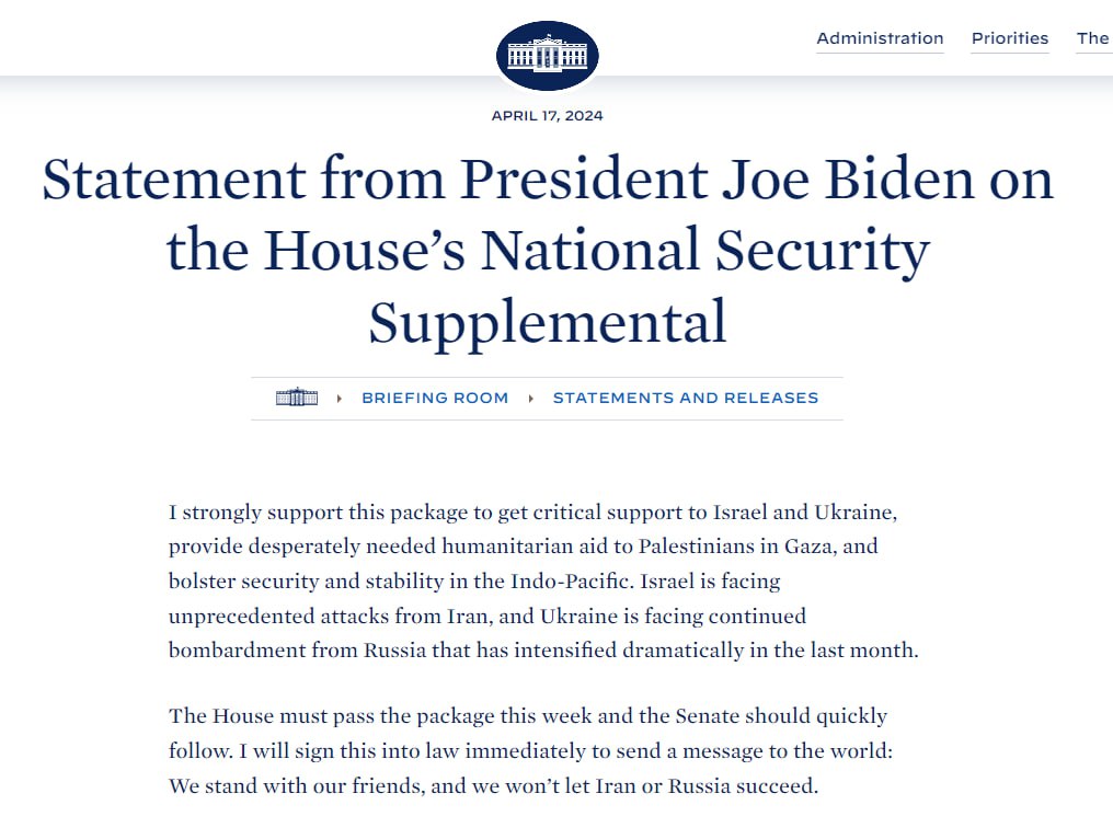 Президент США Джо Байден выразил готовность подписать в случае одобрения Конгрессом законопроекты о дополнительном финансировании Украины, Израиля и Тайваня, которые внес спикер Палаты представителей Майк Джонсон.
