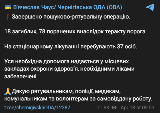 07:40 Число погибших в Чернигове после вчерашнего удара выросло до 18. Еще 77 человек пострадали, среди них четверо детей.