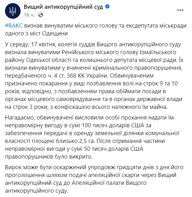Высший антикоррупционный суд Украины приговорил мэра Рени Одесской области Игоря Плехова к 9 годам тюрьмы, а экс-депутата местного горсовета Ивана Пойдолова - к 10.
