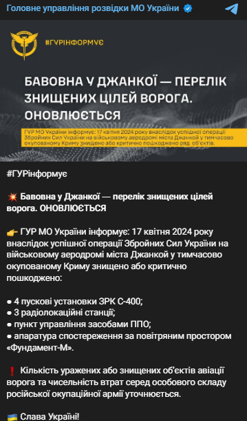 Ранее представитель ГУР Андрей Юсов сообщил, что на военном аэродроме в Джанкое ударом 17 апреля были поражены пусковые установки комплексов противоракетной, противовоздушной обороны, радиолокационные системы и самолеты российской армии.