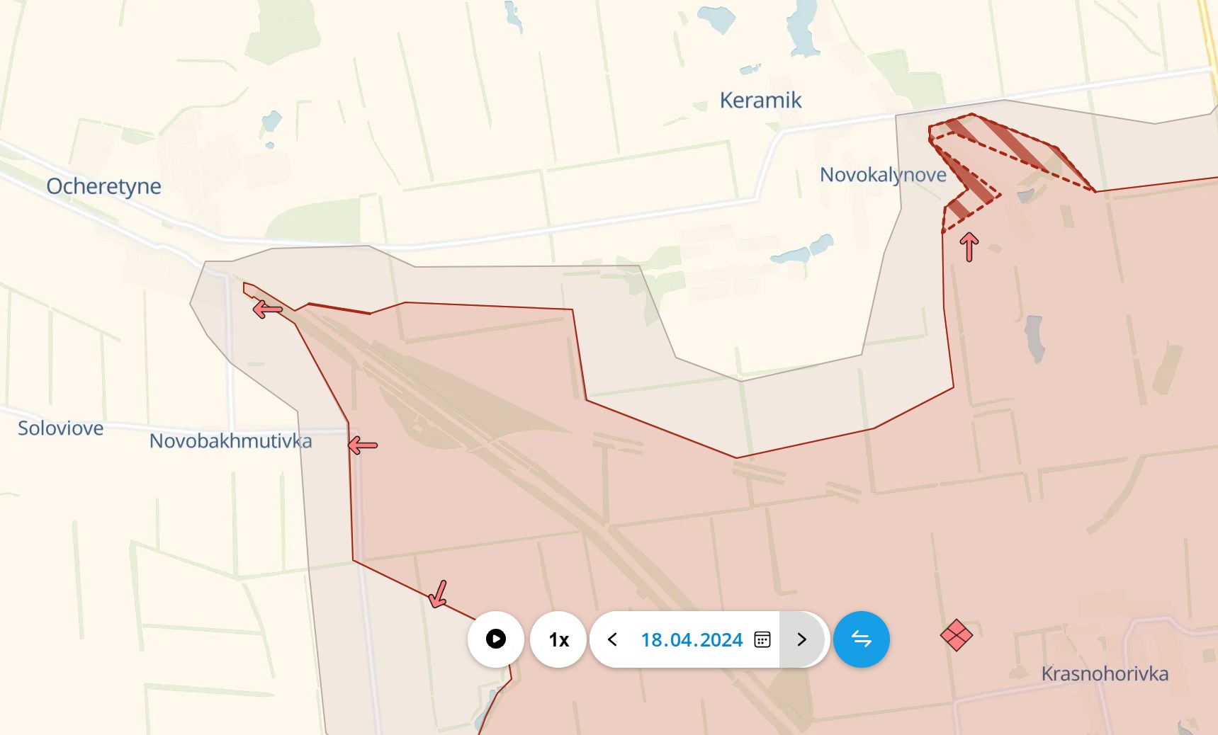 В соседнем Очеретино российские войска продвинулись на три километра вдоль железнодорожной линии, сообщает Институт изучения войны. Также он подтверждает, что россияне вошли в юго-восточную часть Новокалиново. То есть продвижение российских войск на данном направлении по меркам нынешней войны достаточно быстрое.