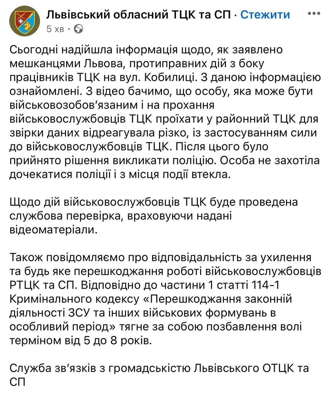 Львовский ТЦК сообщает, что проведет расследование по действиям своих сотрудников на видео с силовой мобилизацией. Военкомы вызвали полицию, но мужчина не дождался ее и скрылся с места.
