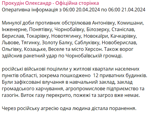 Об этом сообщает глава Херсонской ОВА Александр Прокудин.