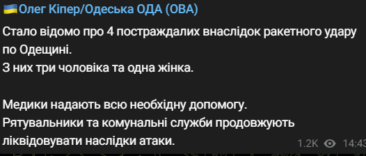 14:44 В Одесской области уже четыре пострадавших после ракетного удара, который был днем. Об этом сообщил глава ОВА Олег Кипер.