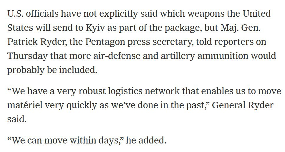 Он уточнил, что в первый пакет помощи будет включено больше боеприпасов для ПВО и артиллерии (как ранее и предполагала "Страна").