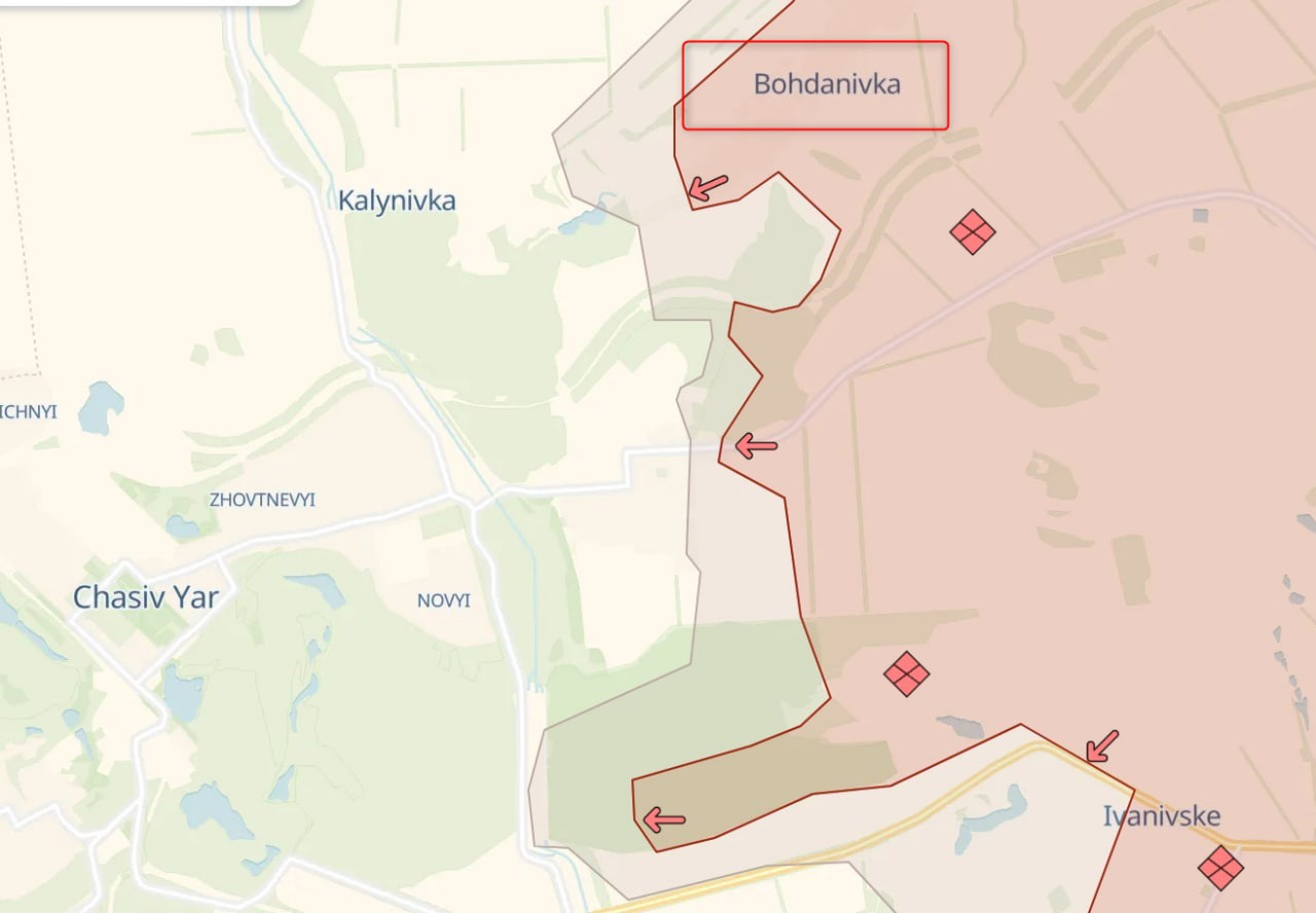 Он тоже говорит, что РФ закрепилась в Богдановке. Также, по его словам, боевые действия происходят в окрестностях Ивановского, которое является "форпостом" перед Часовым Яром (напомним, по данным украинских пабликов, ВСУ контролируют только западные окраины села, а россияне говорят о захвате всего населенного пункта).