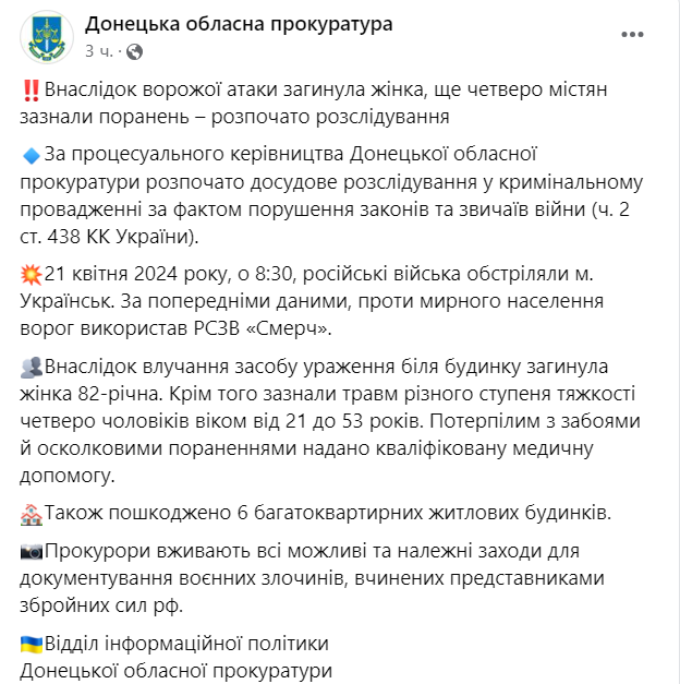 Донецкая прокуратура сообщила, что российские военные обстреляли Украинск предварительно с помощью РСЗО "Смерч".