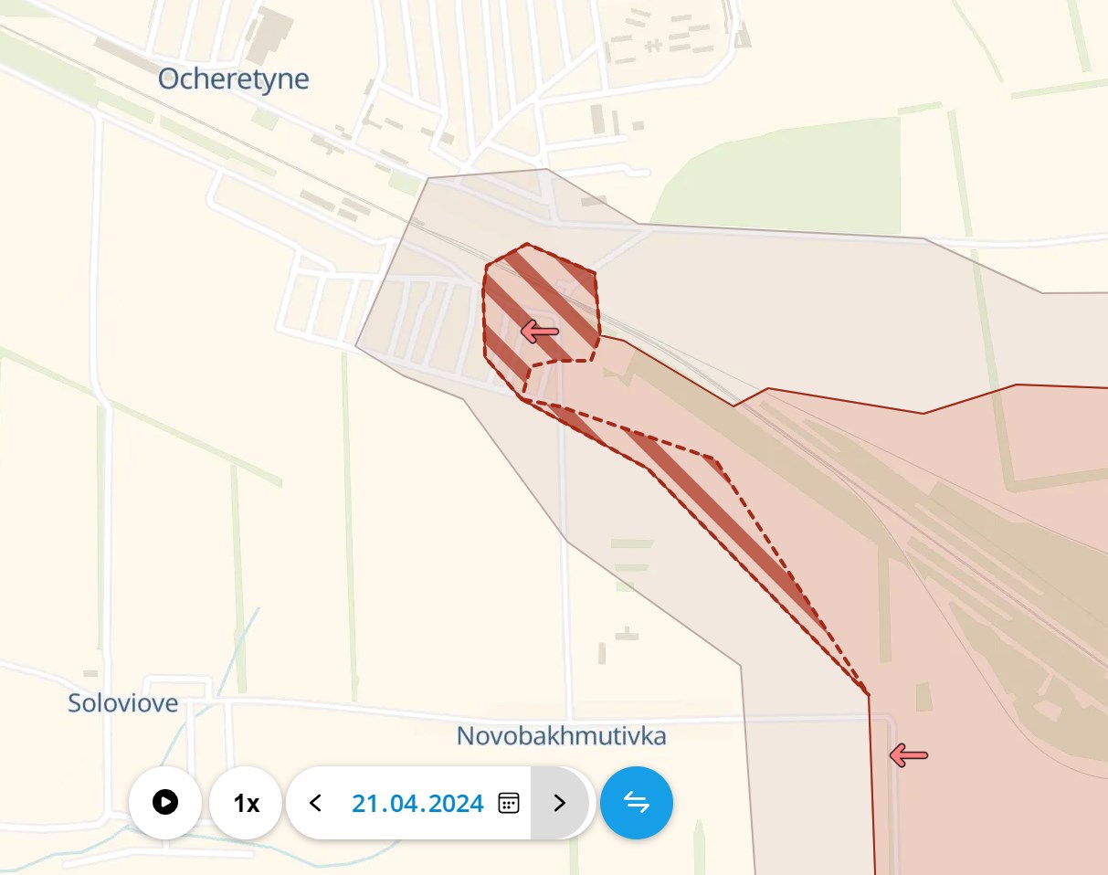 Также, по данным Deep State, противник продвинулся в Очеретино. Причем, судя по динамике карты, довольно существенно.