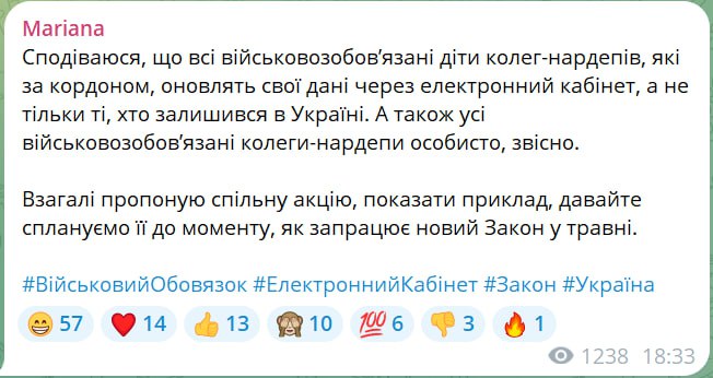 "Надеюсь, что все военнообязанные дети коллег-нардепов, которые за границей, обновят свои данные через электронный кабинет, а не только оставшиеся в Украине. А также все военнообязанные коллеги-нардепы лично, конечно. Вообще предлагаю общую акцию, показать пример, давайте спланируем ее до момента, как заработает новый закон в мае", – написала Безуглая.