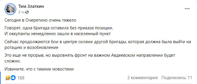 "Сейчас продолжаются бои в центре силами другой бригады, которая должна была выйти на ротацию и возобновление. Это еще не прорыв, но выровнять фронт на важном Авдеевском направлении будет сложно", – добавил волонтер.